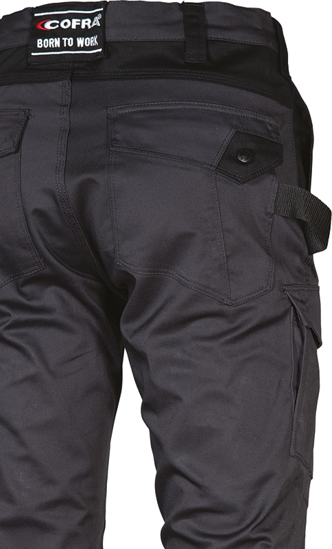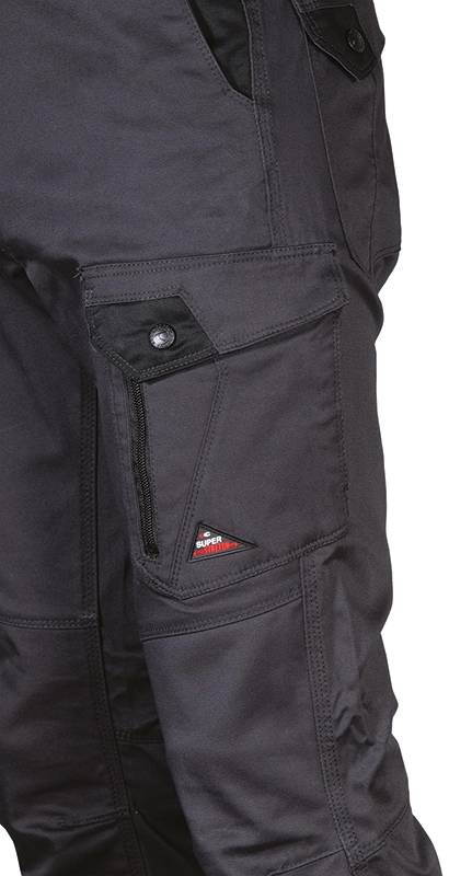 Descrizione:2 ampie tasche anteriori, doppia tasca posteriore con pattina chiusa con snap, passante portamartello, taglio ergonomico di gambe e ginocchia, tasca laterale destra chiusa con snap, tasca laterale sinistra con doppia apertura (chiusa con snap e con zip), tessuto ad elevata percezione elastica